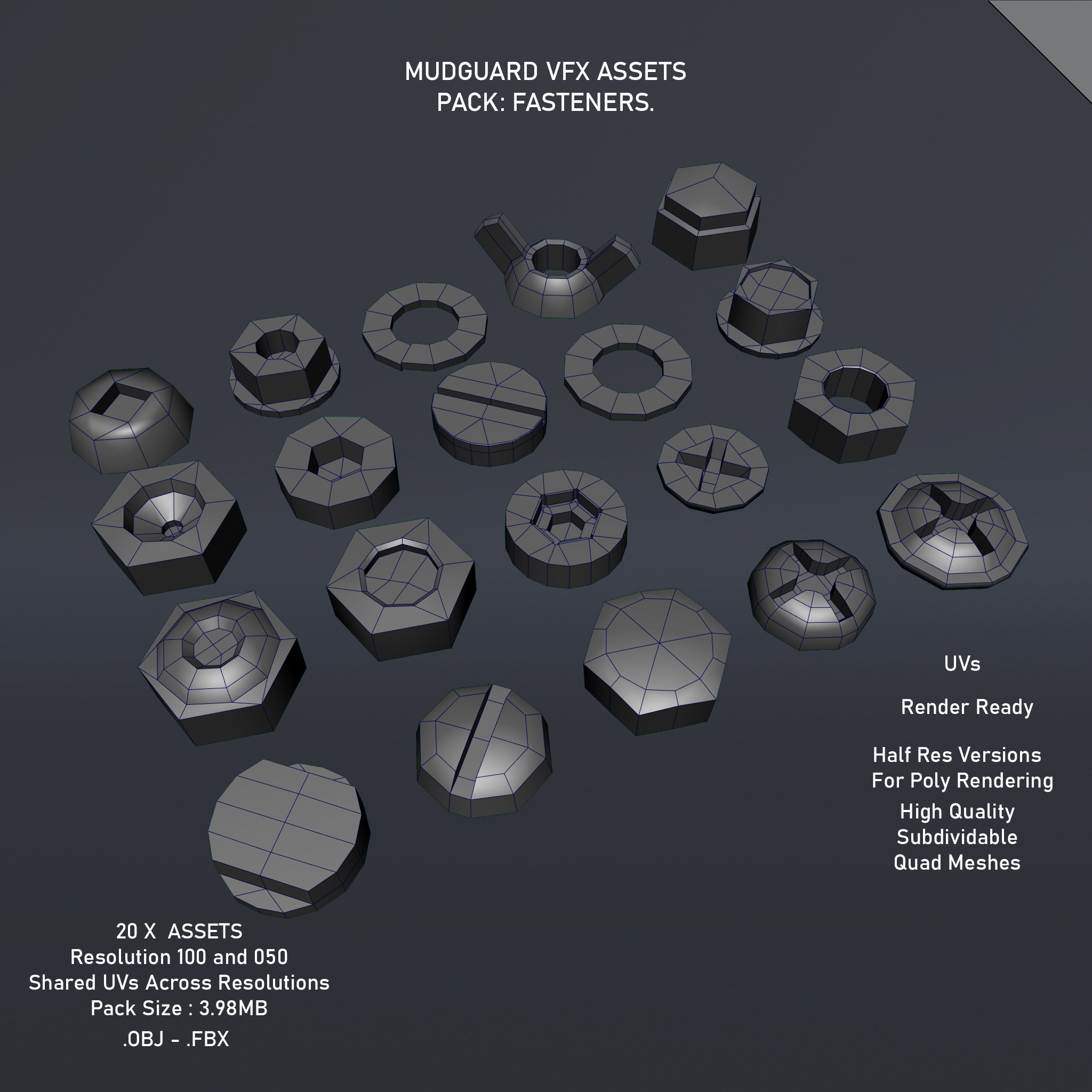 High quality VFX render ready assets. Subdividable Quad Meshes. Assets available in both hero and half resolutions. All assets uvd and packed into one tile (1001)